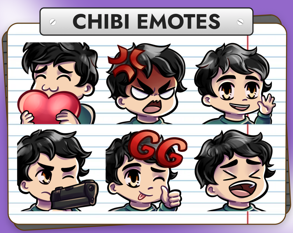 12 Black Hair Chibi Boy emotes pack for Twitch, Discord, Youtube.