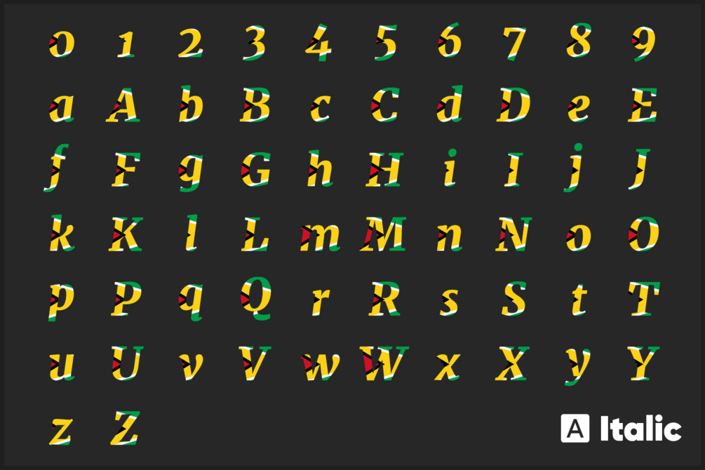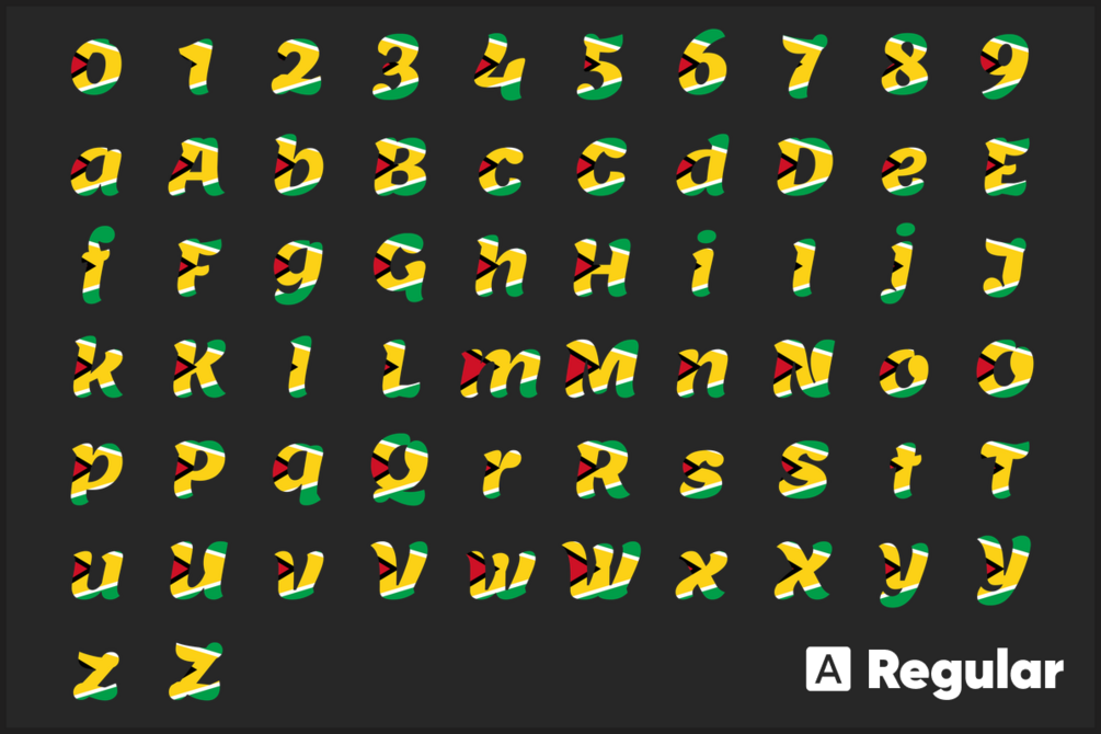 Guyana Font free download Font, Alphabet. Our collection of Guyana Font free download flag fonts features high-quality PNG images in a variety of sizes to fit all your crafting needs. These fonts are perfect for creating unique t-shirt designs, scrapbook pages, photo albums, greeting cards, coffee mugs, and more. Use them with your Cricut or Silhouette cutting machines, or with any graphic design software such as Photoshop, Illustrator, Inkscape, Figma, and Sketch.