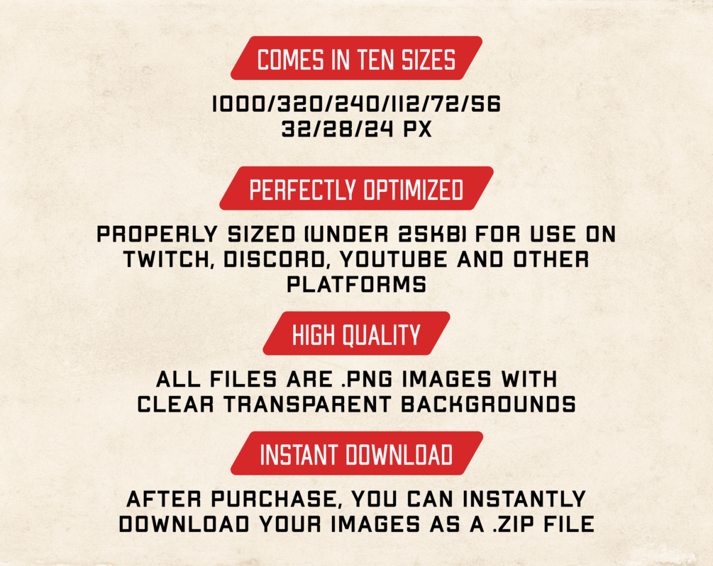– 20 emote in 10 sizes – files are .png with transparent backgrounds – Compressed .ZIP format